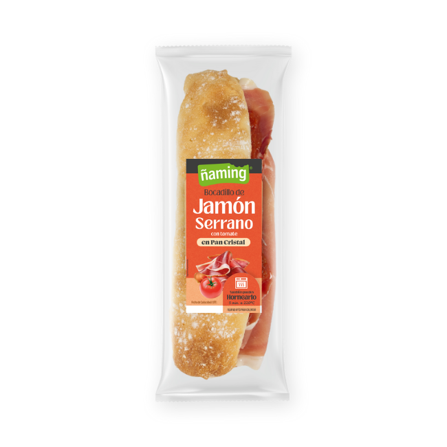 Un bocadillo en pan cristal con jamón serrano y tomate fresco. La sencillez de un clásico con la textura ligera y crujiente del pan cristal, ideal para disfrutar en cualquier momento del día.